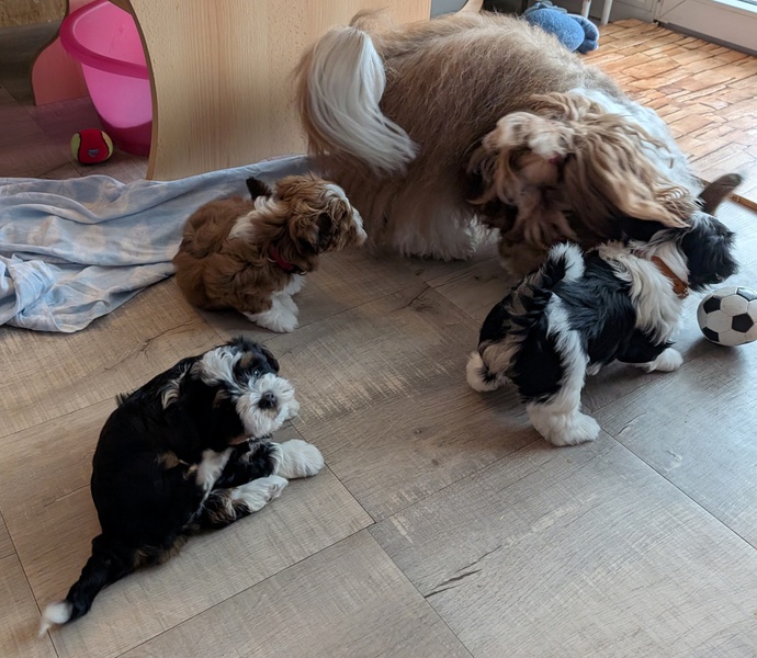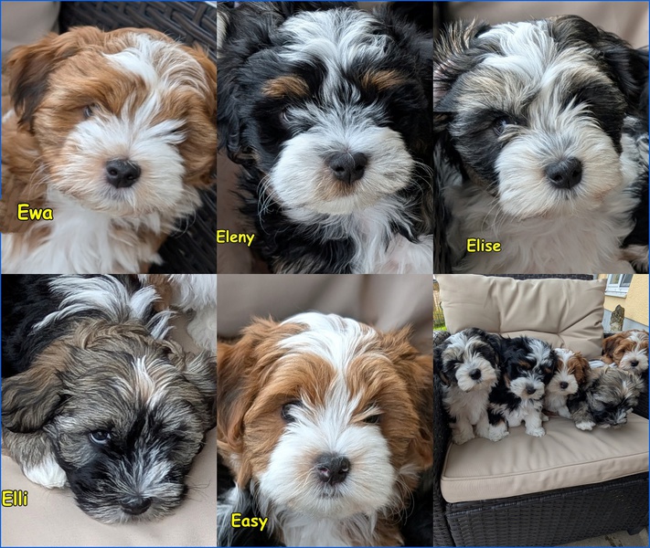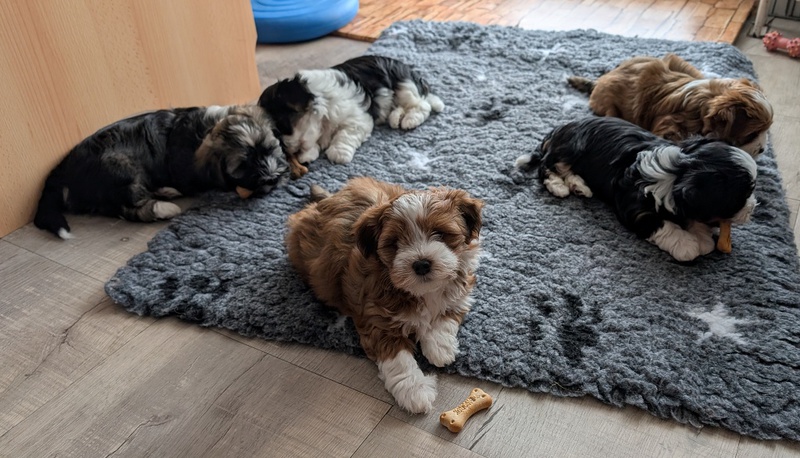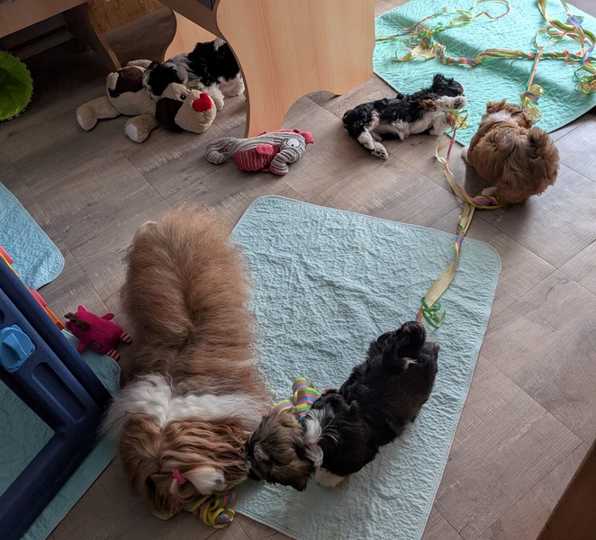 06. + 07.07.2025 die E-Mädchen sind 5 Wochen alt. Alle fünf gedeihen weiter prächtig. Die Kleinen fressen inzwischen sehr gut alleine und auch ihr Output könnte nicht besser sein. Eleny hatte als erste Besuch. Doch es hat mit der Familie nicht gepasst. So wurde Eleny wieder frei. Welch ein Glück, denn nur ein paar Tage später kam die perfekte Familie für die zuckersüße trikolor Hündin. Eleny hat sich ihre Familie selbst ausgesucht und Herzen erobert. Auch Elise hatte Besuch, und auch bei ihr passt es super. Elise wird in einen Haushalt mit zwei weiteren Havis ziehen. Züchterfrauchen freut sich sehr darüber. Und Elli hatte heute Besuch und hat ihre neue Familie vollständig von sich überzeugt. Elli wird später Mala gerufen und zieht nach Emmendingen. Seit dem zweiten Besuch letzte Woche waren alle fünf E-Mädchen gegenüber den ihnen völlig fremden Menschen sehr offen, neugierig und gar nicht scheu. Eben echte Havaneser. ;-)
