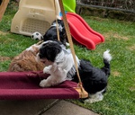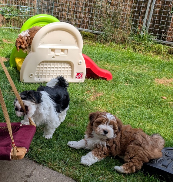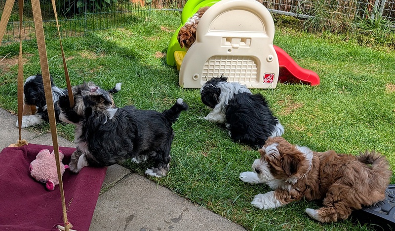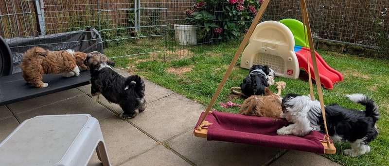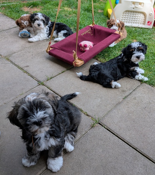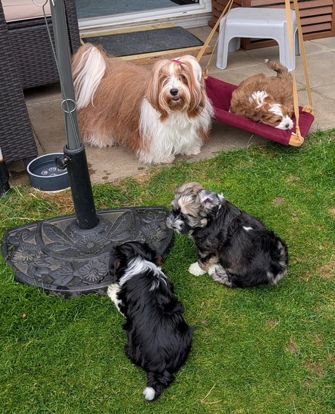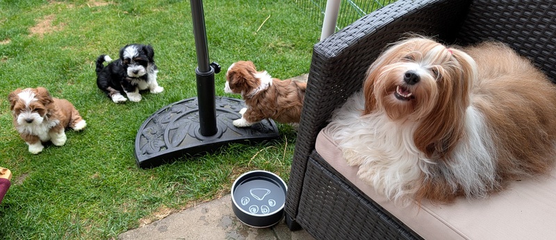 13.07.2025 Die Welpen sind 6 Wochen alt. Wie schnell doch wieder die Zeit vergeht. :-) In der vergangenen Woche durften die Welpen mit den großen Havis im Garten rennen. Mutti Djulja, Uroma Luzie und Oma Beany hatten großen Spaß mit den Kleinen. Allerdings währt das nur so lange wie die Welpen nicht ins Fell oder an die Bäuche der großen Havis gehen. :-) Die Welpenschaukel kam super an bei den Kleinen. Auch die ins Welpengehege gestellten Körbchen finden die fünf Mädchen richtig bequem. Bald wird die Wurfbox ausgedient haben und wieder in den Keller wandern.