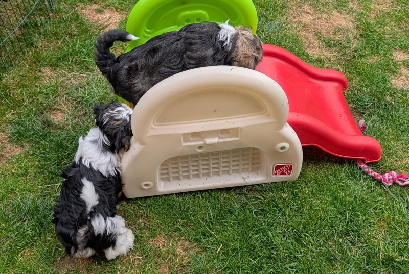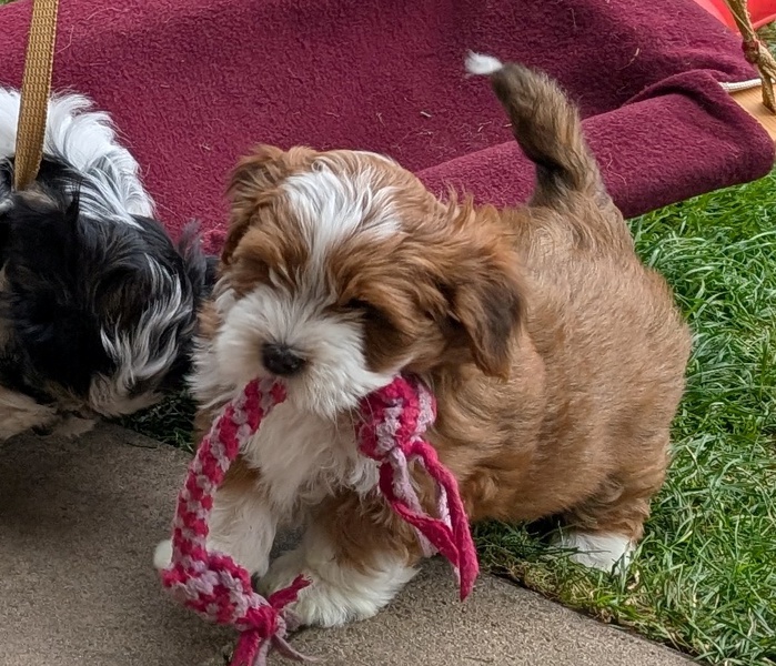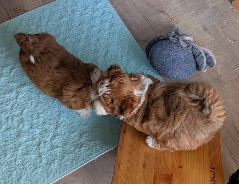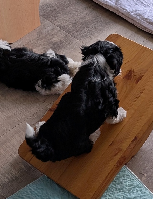 aus Holz als Spielgerät im Rennen. Seit zwei Tagen finden alle Welpen die Wippe toll zum drüber laufen. Und genau wie die großen Havis sind die fünf kleinen begeistert von ihren Rinderhufen zum