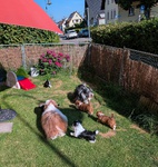 Ewa hatte Besuch und ist jetzt vergeben. Die Welpen spielen und toben täglich im Garten wenn es nicht regnet. Bei Regen geht es nur auf die Terrasse oder es wird drinnen gespielt. Z.B. mit Luftschlangen Party machen.