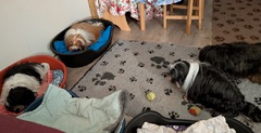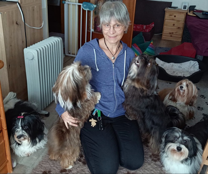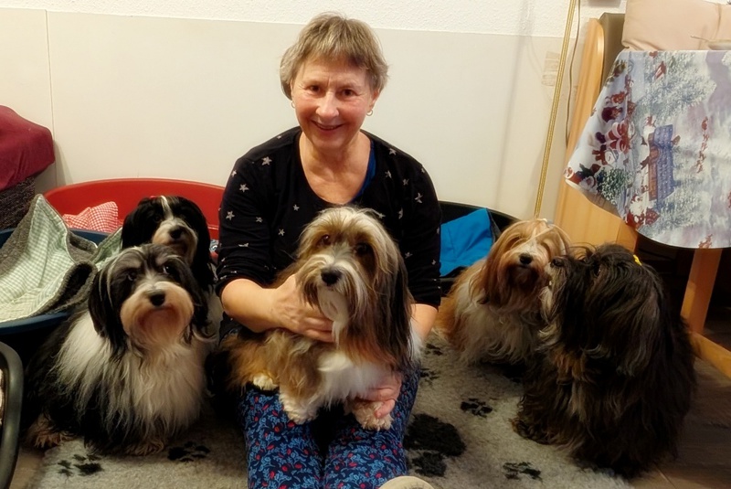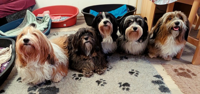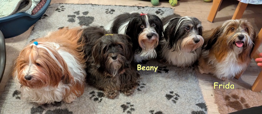 Das war ein richtig schöner Kaffeeklatsch Nachmittag mit Fridas Frauchen Manuela und Beanys süßer Tochter Caramel ChaCha, jetzt Frida. Wie immer wenn einer der ehemaligen Welpen zu Besuch kommt genügt den großen Havis ein kurzes, kontrollierendes Schnuppern und sie wissen wer da zu Besuch ist. Nur Djulja kennt ihre ältere Halbschwester Frida nicht seit ihrer Geburt. Aber Djulja hatte Frida schon öfter getroffen und deshalb waren alle fünf Havis gleich sehr vertraut mit einander. Frida war zum Baden und Auskämmen gekommen. Sie hat sich vorbildlich benommen in der Wanne und beim Blowern. Sogar das Auskämmen von ein paar Filzies hat sie ohne zu murren ertragen. Danach war Fridas Haar wieder streichelweich und sie mit ihrem Züchterfrauchen wieder gut Freund. Frida ist eine entzückende, zierliche Rassevertreterin in der Farbe Rotzobel mit weißen Abzeichen. Ihre Eltern sind meine Beany und der Havaneser Rüde Ricci Alcado siehe C-Wurf 2021.