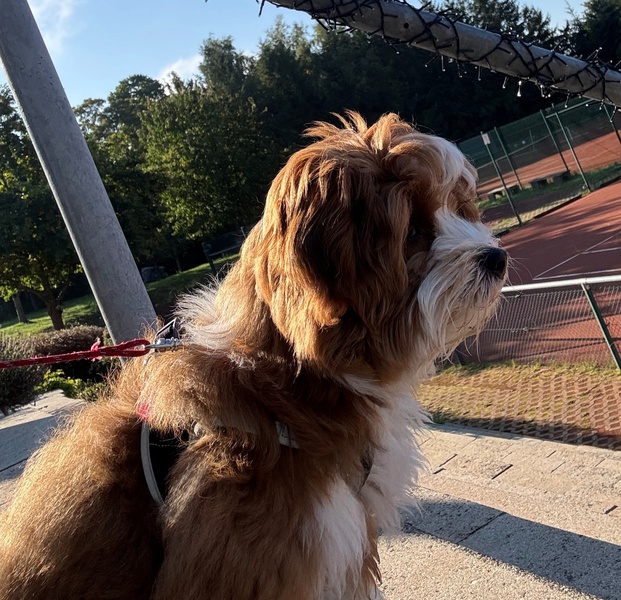 auf dem Tennisplatz schaut sie interessiert zu wie Frauchen trainiert. Vielen Dank an Frauchen Lisa für die schönen Fotos.