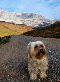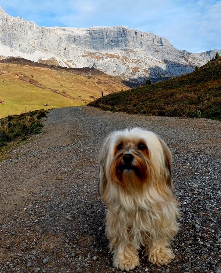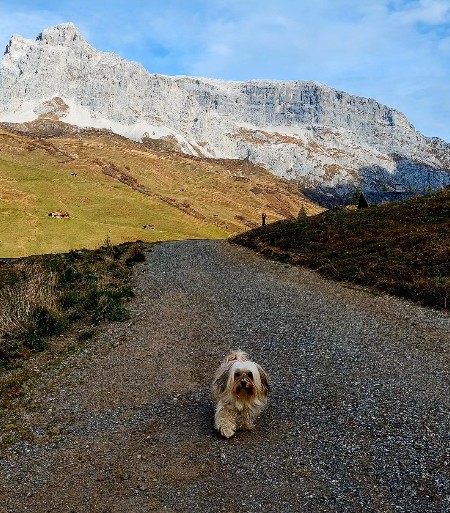 Cara lebt mit ihrer Familie in der Schweiz. Das Panorama auf den Fotos die sie schickt ist immer umwerfend. Und Cara liebt den Schnee im Winter. Mit Herrchen ist sie oft auf der Alpe in der
